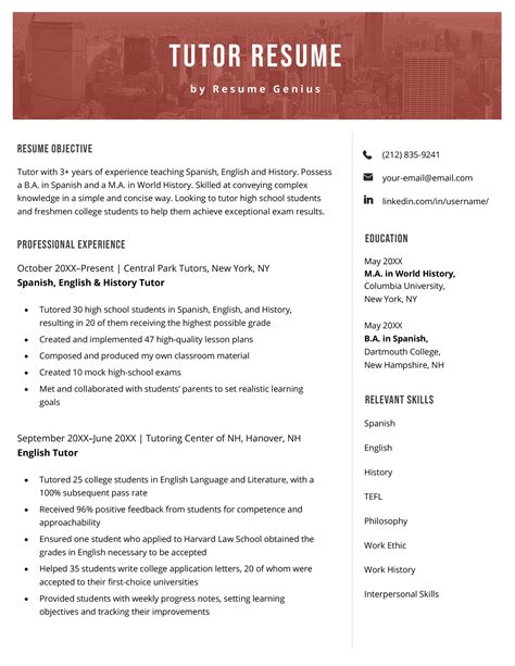 Learn what a tutor is and explore a list of tips for writing a tutor resume along with two example resumes and a template to help. Your responsibilities typically include assessing student needs, designing tailored lesson plans, providing targeted. Tips and examples of how to put skills and achievements on a tutoring resume.